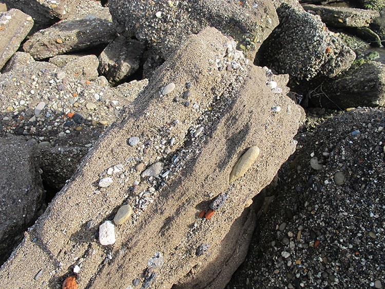 Il ne faut pas chercher très loin pour trouver, entre les couches de sable pétrifié, des restes de briques, des cannettes de soda, des bouts de verre et même du plastique : les experts ont donné à ces débris le nom de technofossiles. En outre, le sable libre recèle lui aussi des secrets ; il suffit d’un aimant pour vérifier que certains sédiments vont se coller à lui, en raison de leur provenance, puisqu’il s’agit de restes de scories issus de l’industrie métallurgique.