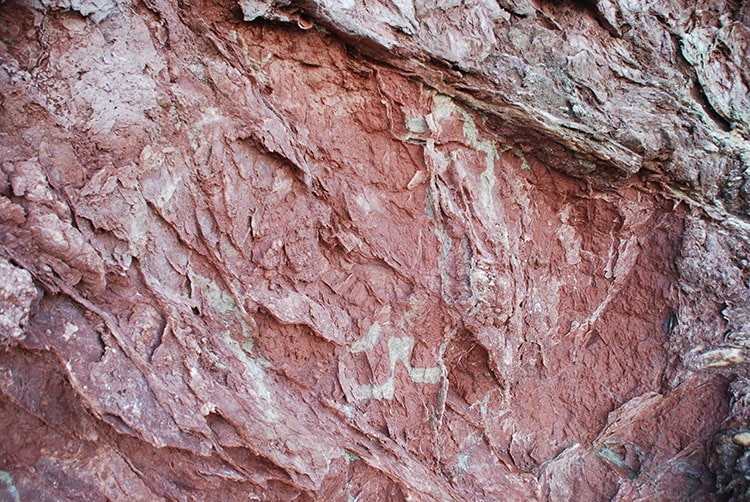 Nous pouvons reconnaître ces roches à leur couleur : les argiles, à la couleur généralement rougeâtre, présentent des veines remplies de gypse, et l’on retrouve les ophites, de couleur verte, par leur configuration en petits îlots. Il s’agit des matériaux les plus anciens que l’on puisse rencontrer tout au long de la Route du Flysch.