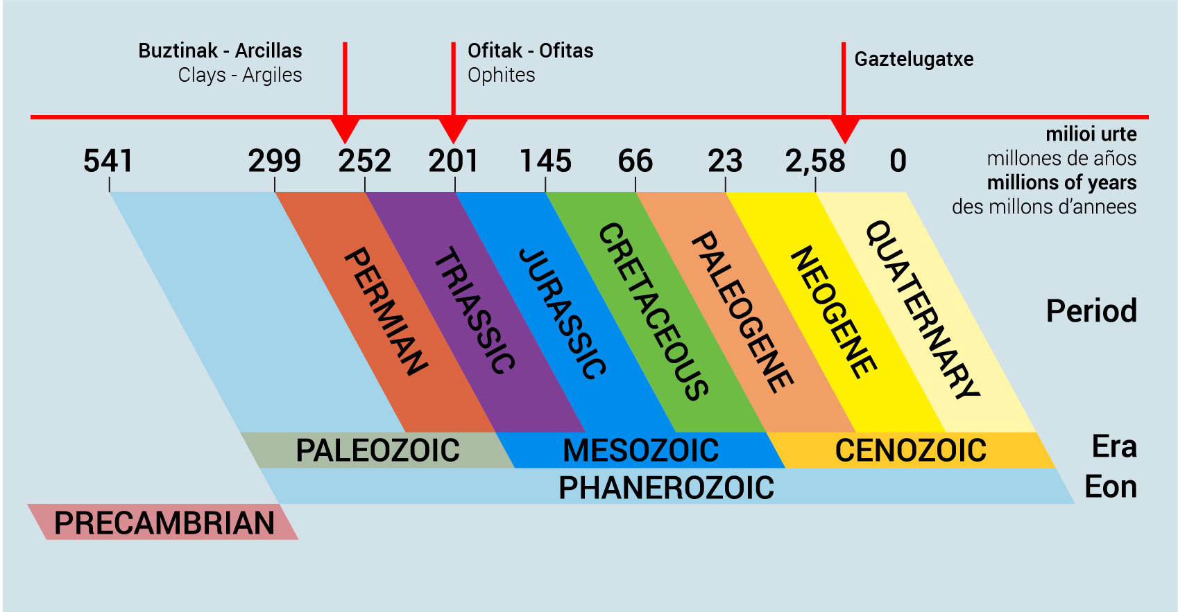 L’indice principal qui nous montre que nous nous trouvons face à un diapir, à Bakio, nous est donné par les argiles et les ophites qui sont exposées à l’est de la plage. Il y a 260 millions d’années, au cours du Triasique, la mer qui recouvrait notre territoire recula petit à petit pour former des lagunes d’eau salée, amenées à s’évaporer ; puis, des argiles, des sels, et des gypses, s’y déposèrent. Les ophites, d’origine volcanique, surgirent seulement plus tard, il y a 200 millions d’années, sous forme de magma – suite à la fragmentation de la Pangée. C’est bien des années après (il y a entre 80 et 15 millions d’années) que les argiles, du fait de leur faible densité et leur malléabilité, commencèrent leur ascension, en entraînant avec elles les ophites.